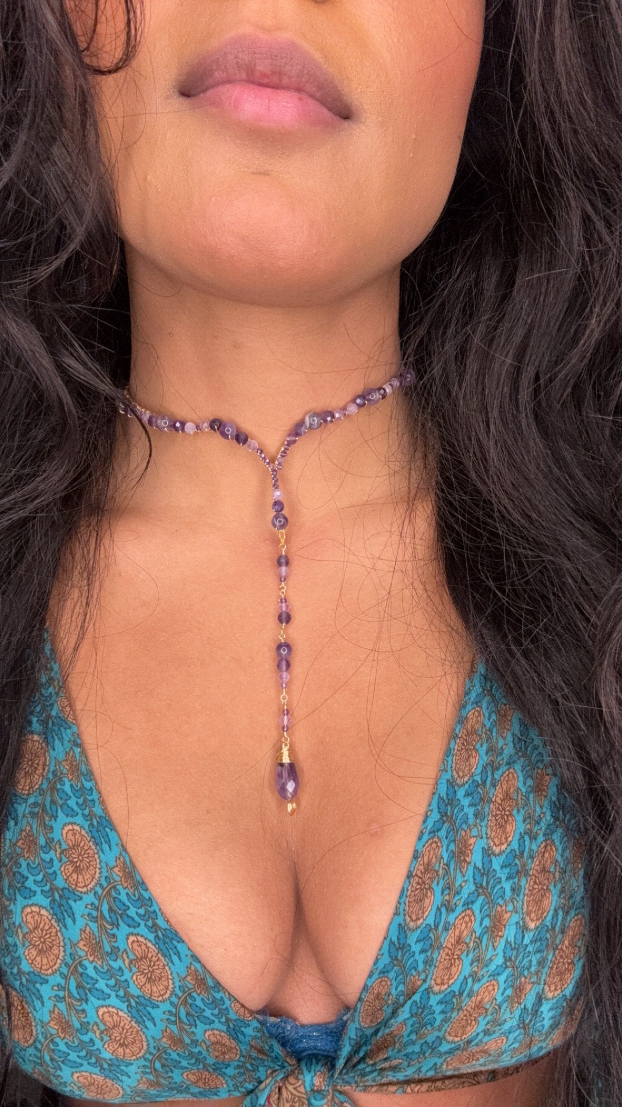 ༺ A beautiful pendant necklace made with amethyst beads and gold wire.