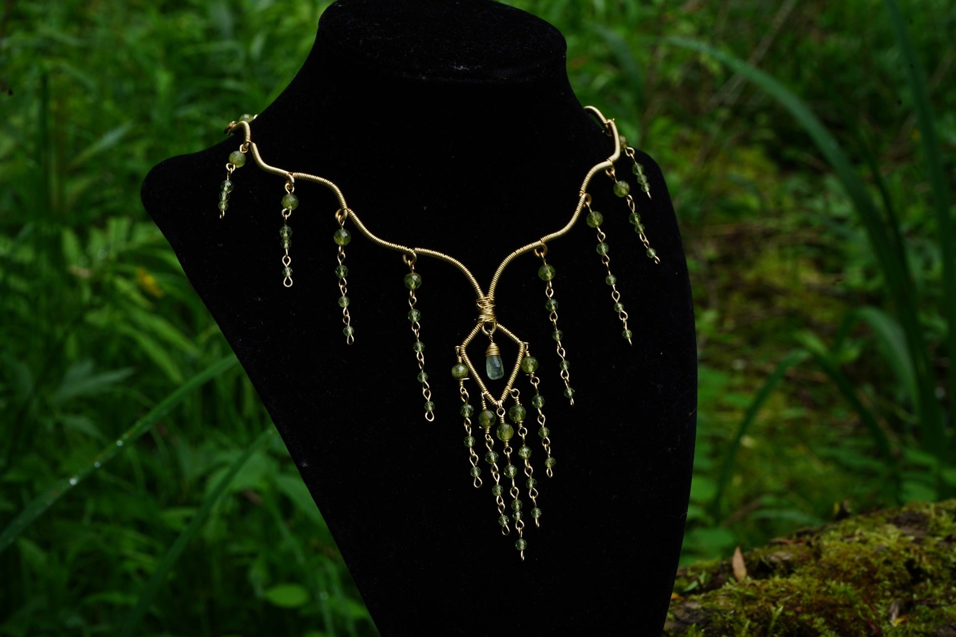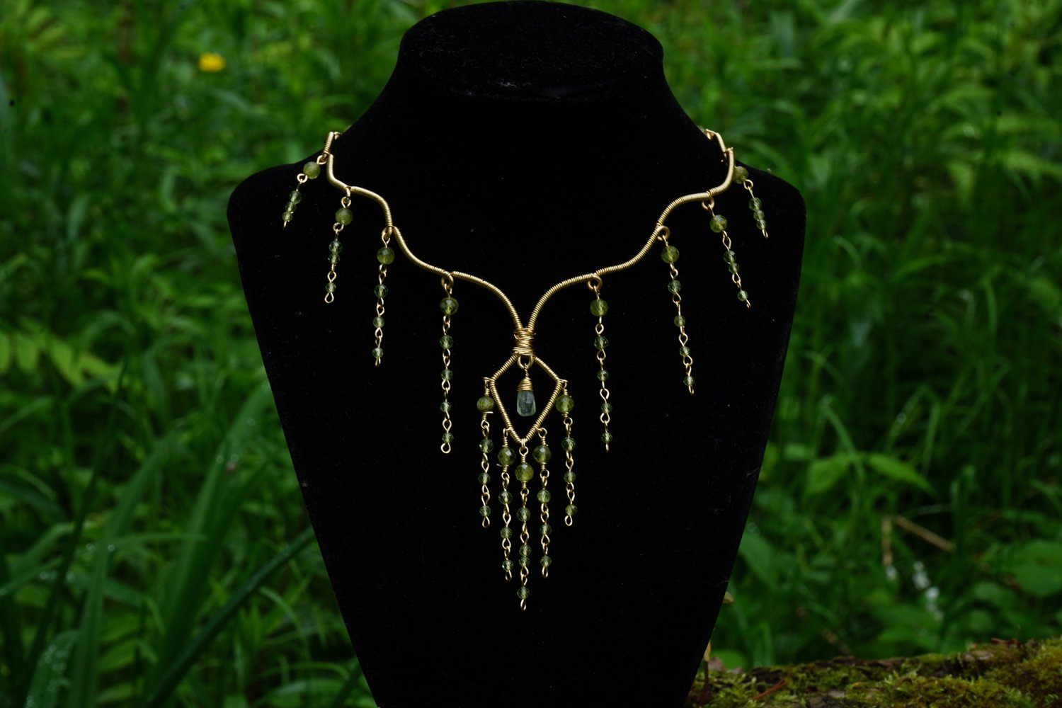 ༺ A mystic and ethereal piece. in a chandelier style peridot beads hang from gold wire featuring a stunning kyanite pendant.