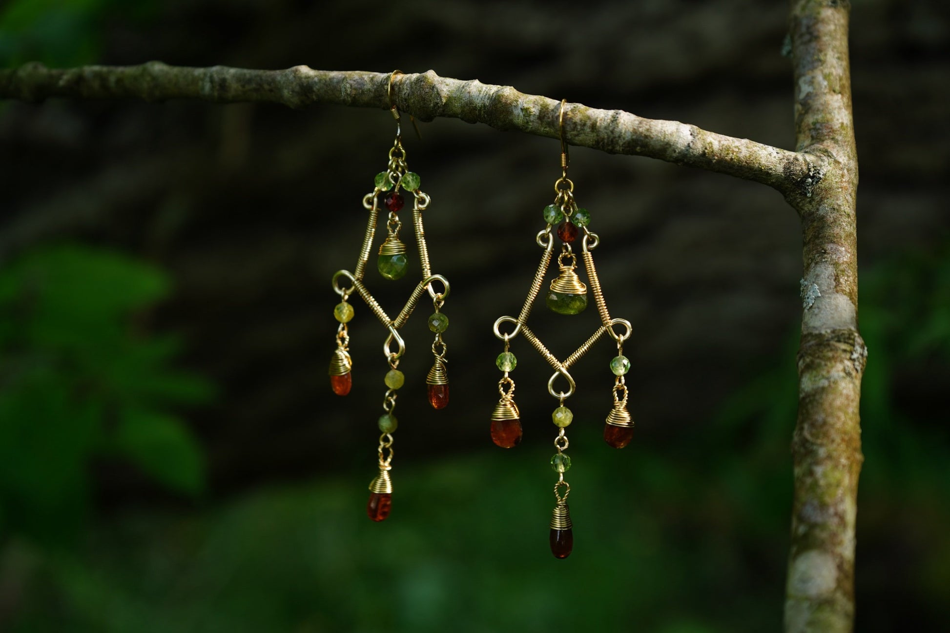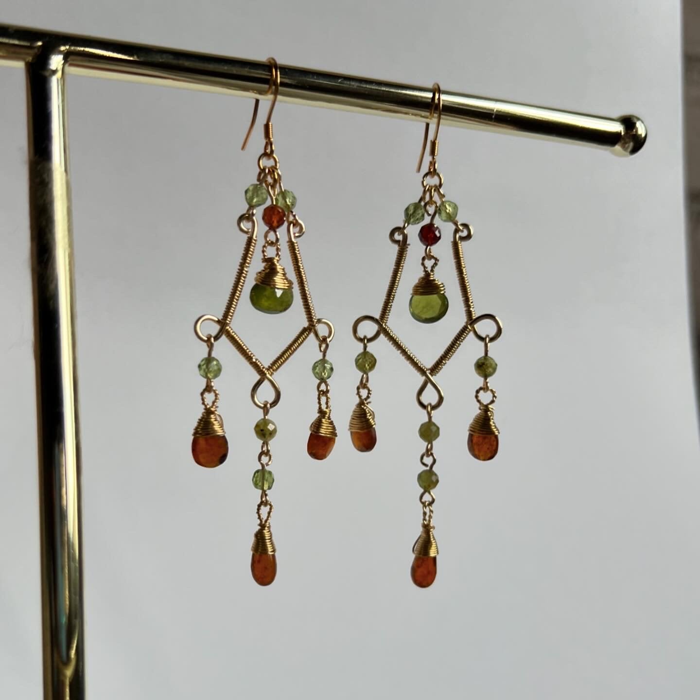༺ Orange and green tones creating and earthy synergy. Dangle earrings featuring vesuvianite and orange kyanite.