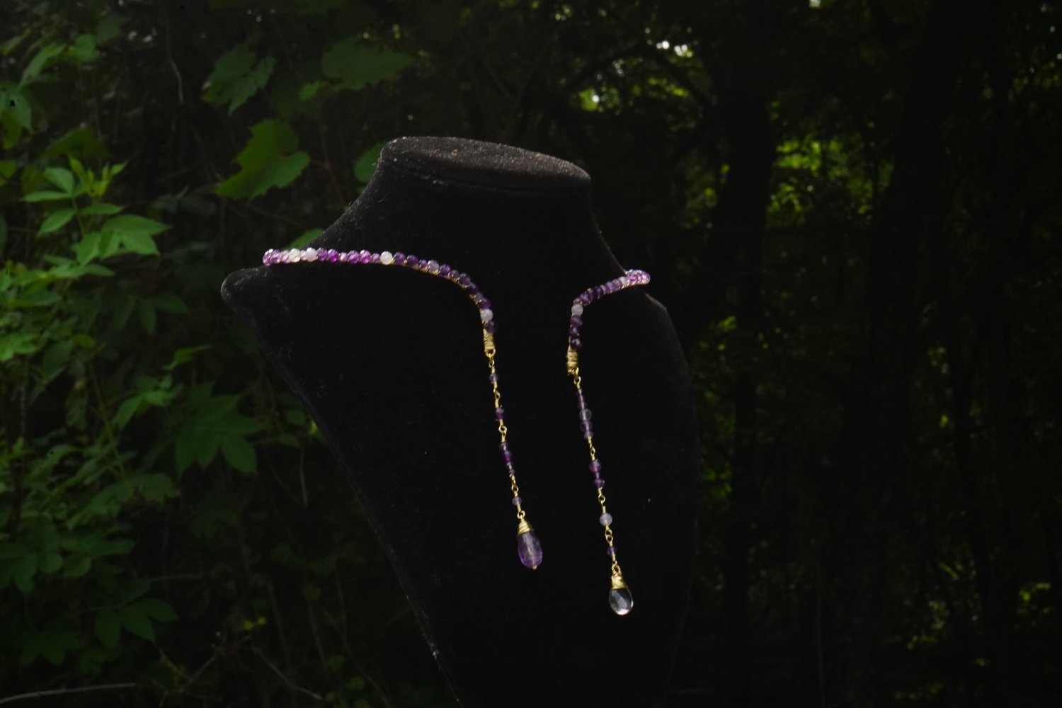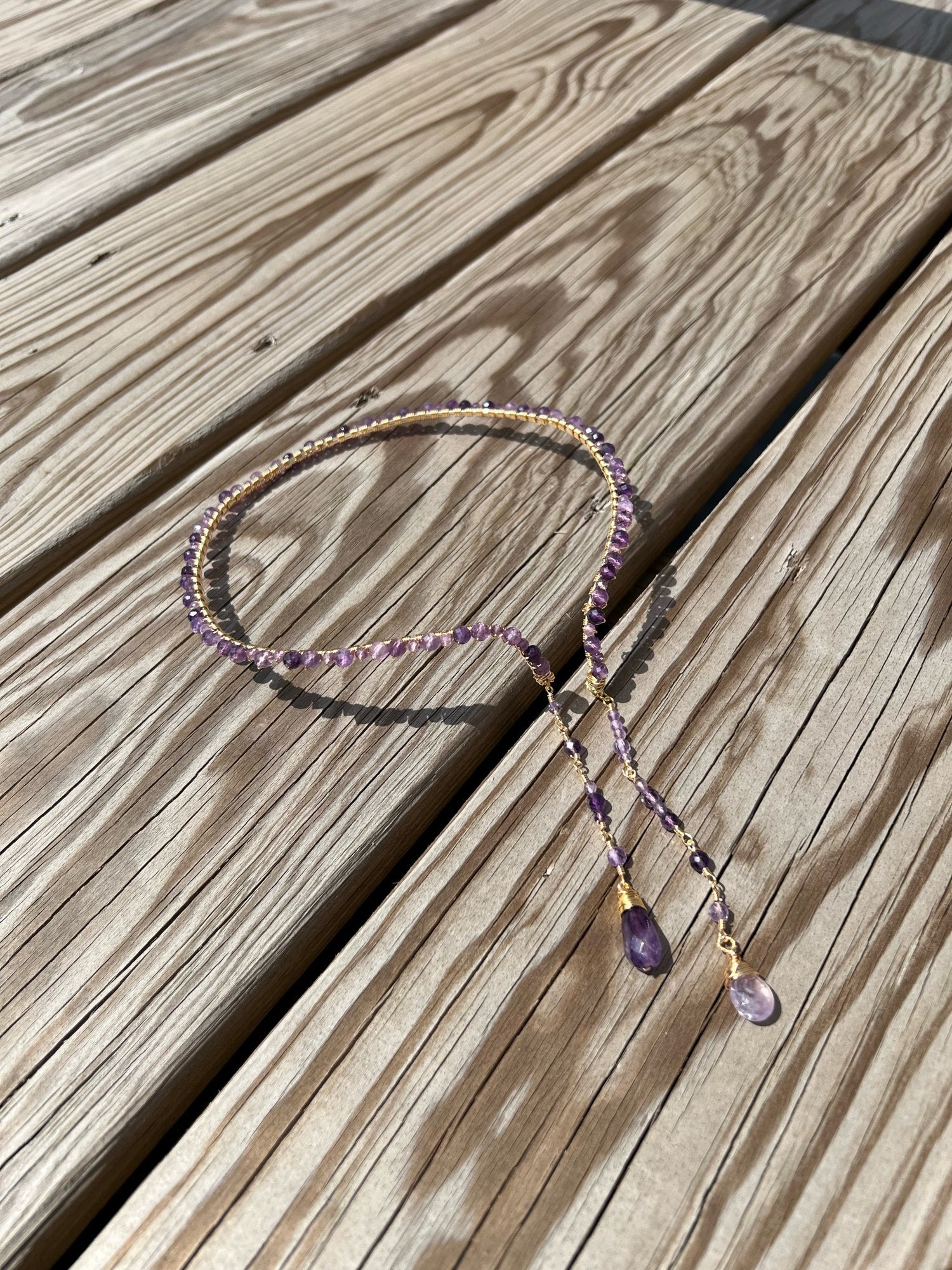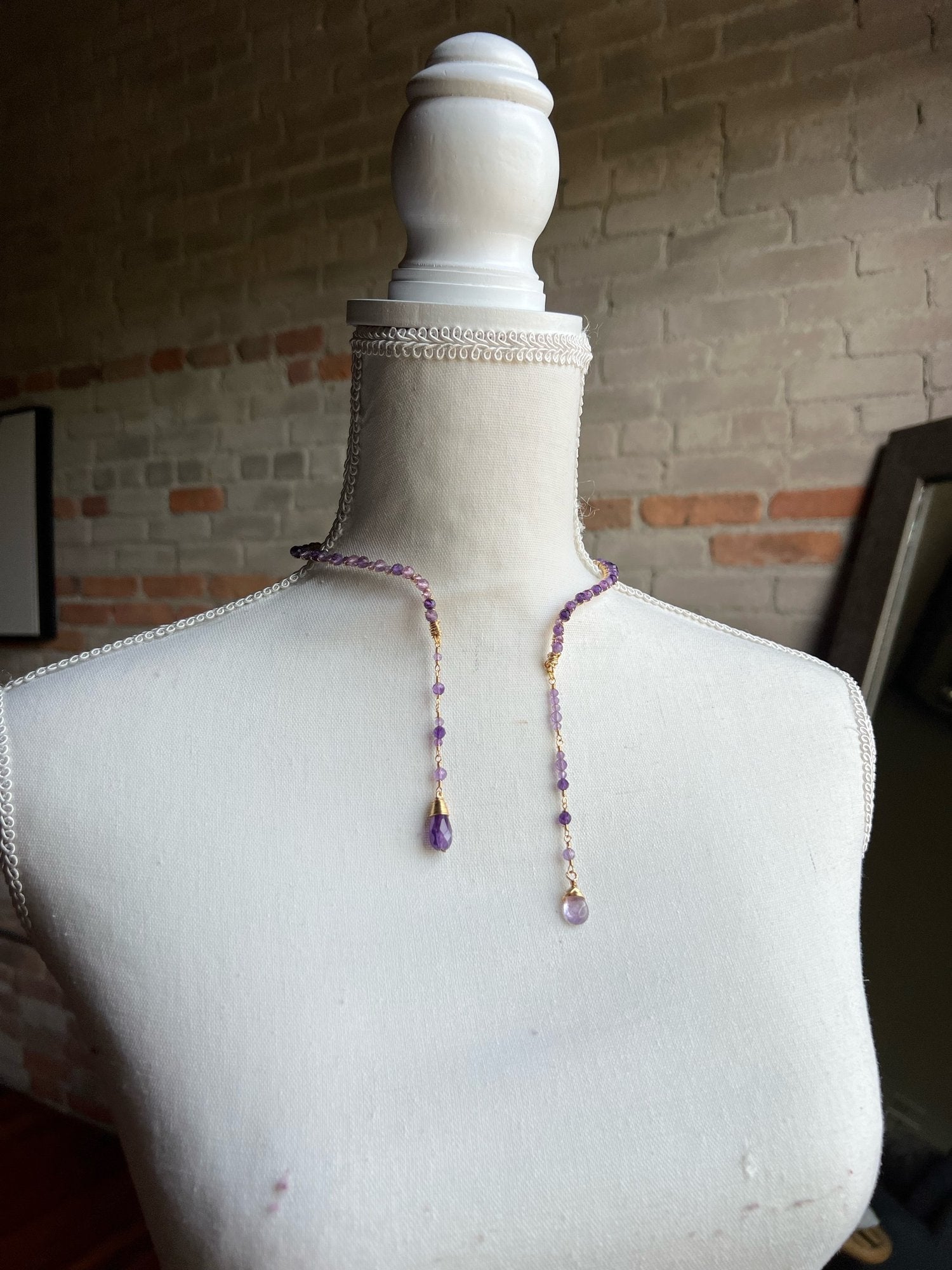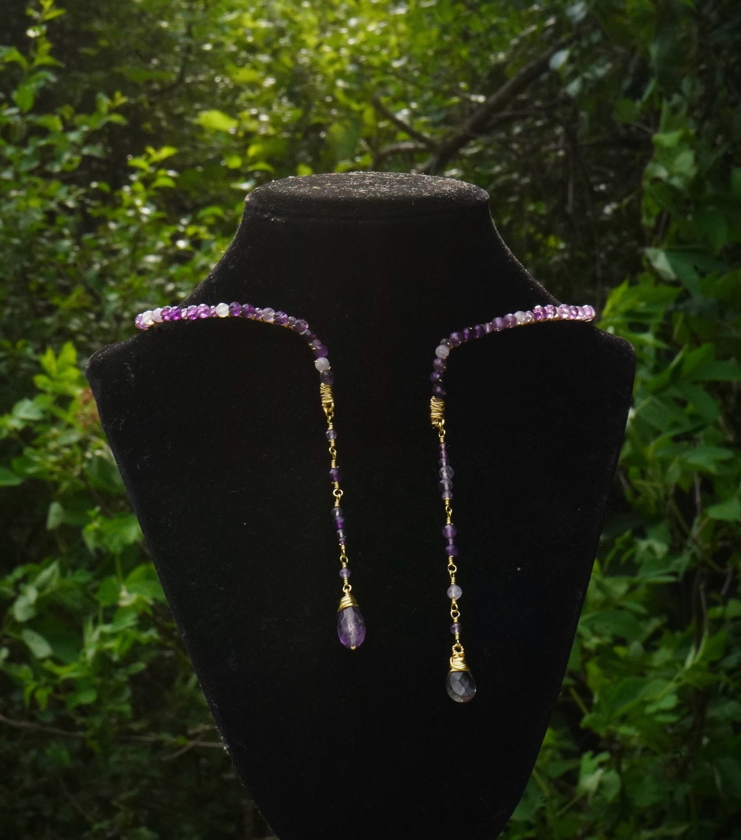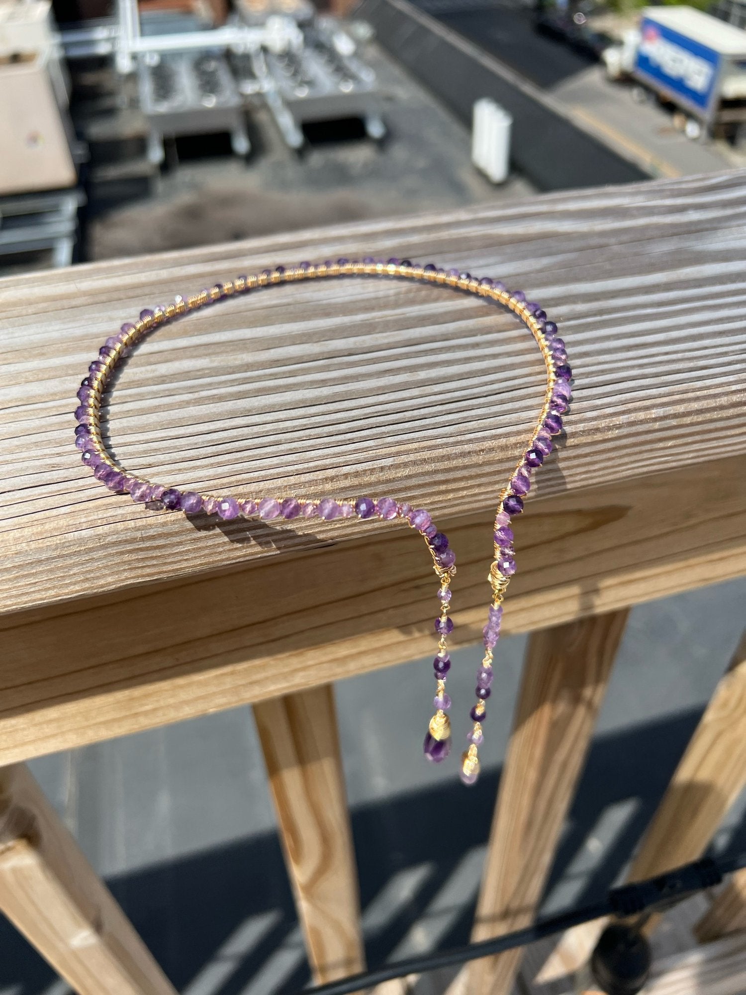 ༺ Stunning amethyst beads enveloping gold wire to create a reversible pendant necklace.