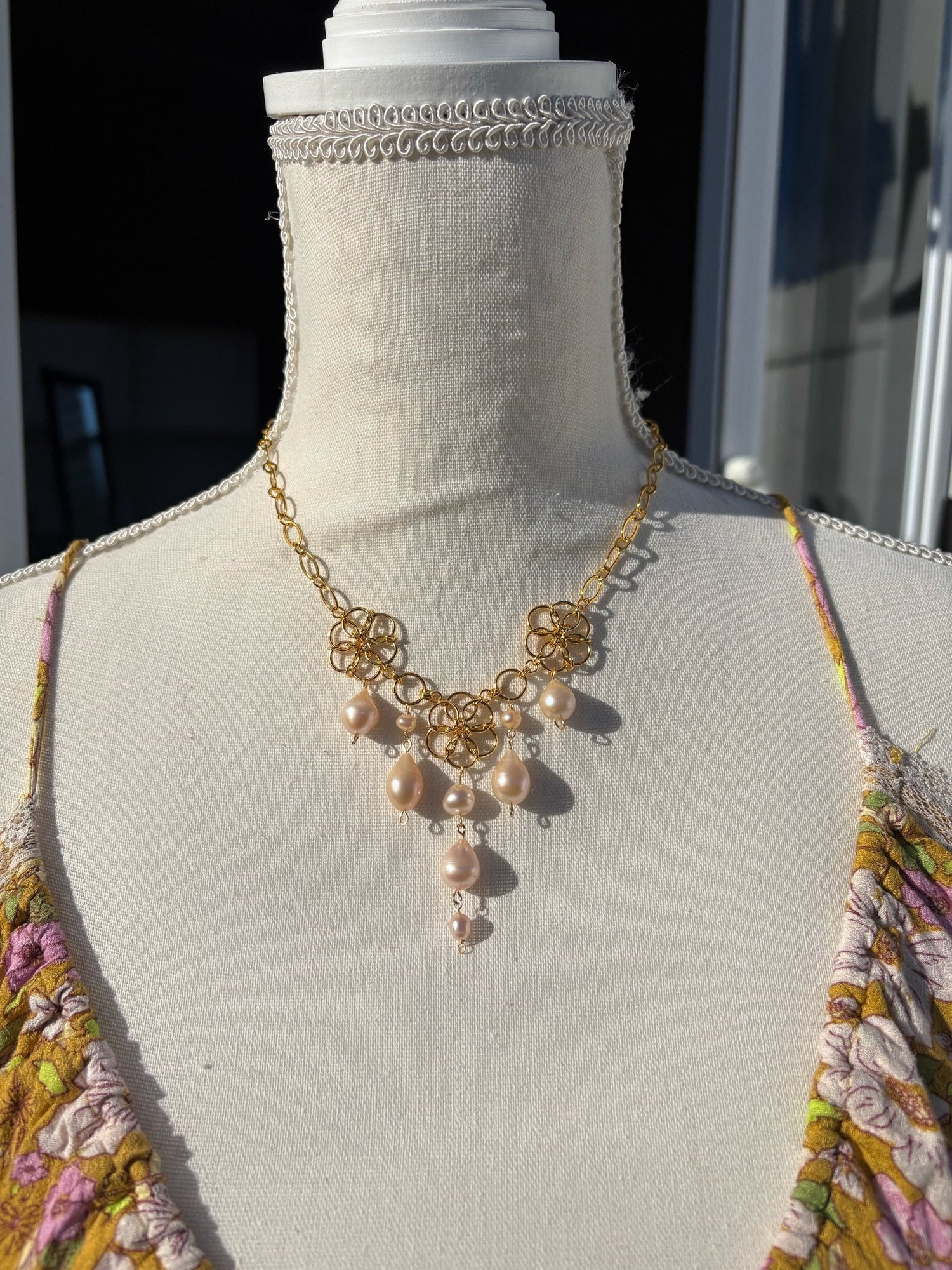 ༺ Gold plated chainmail flowers adorned with freshwater pearls