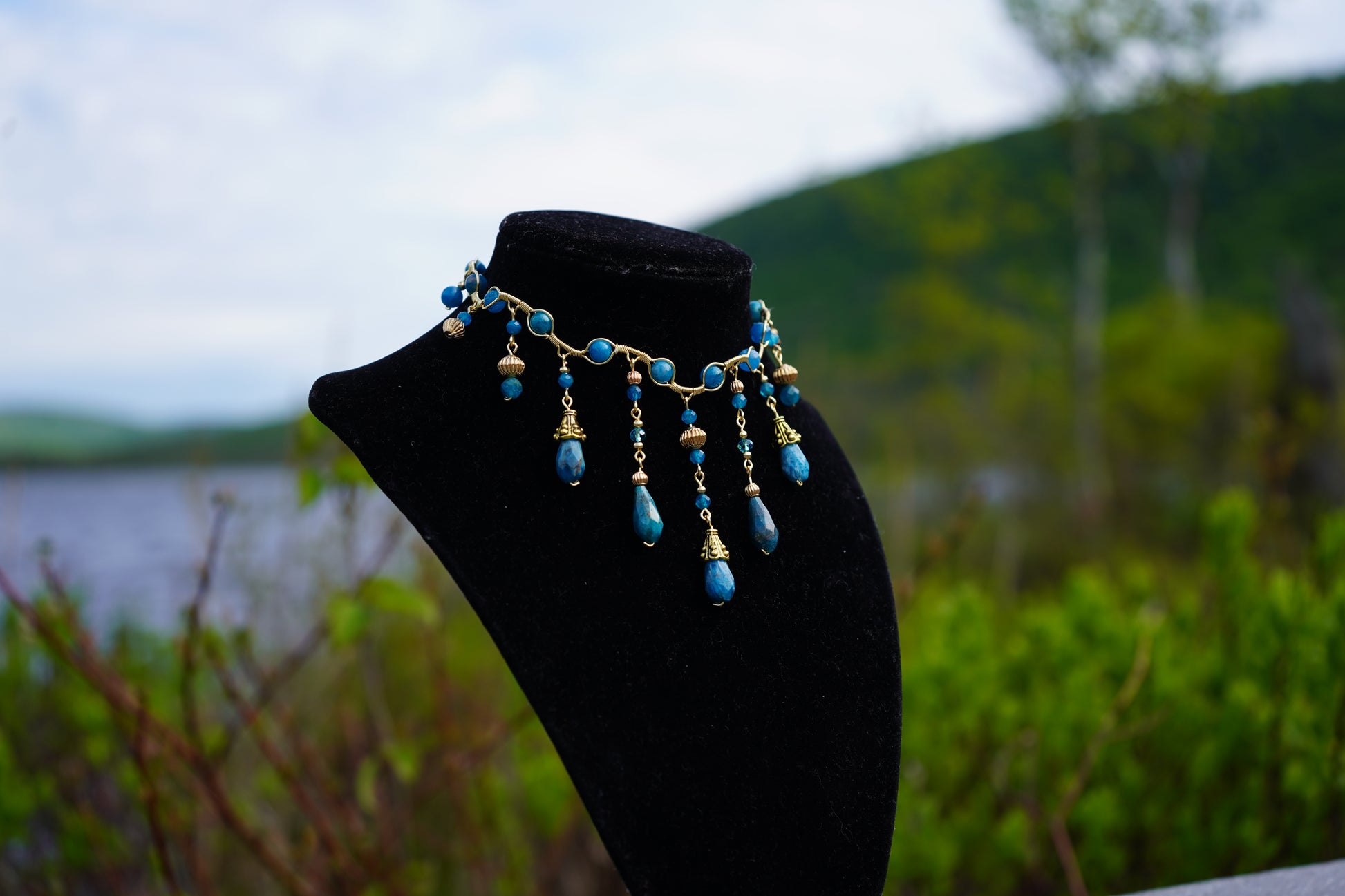 ༺ A beautiful display of bead work. This piece features beautiful deep blue apatite wrapped in gold wire.