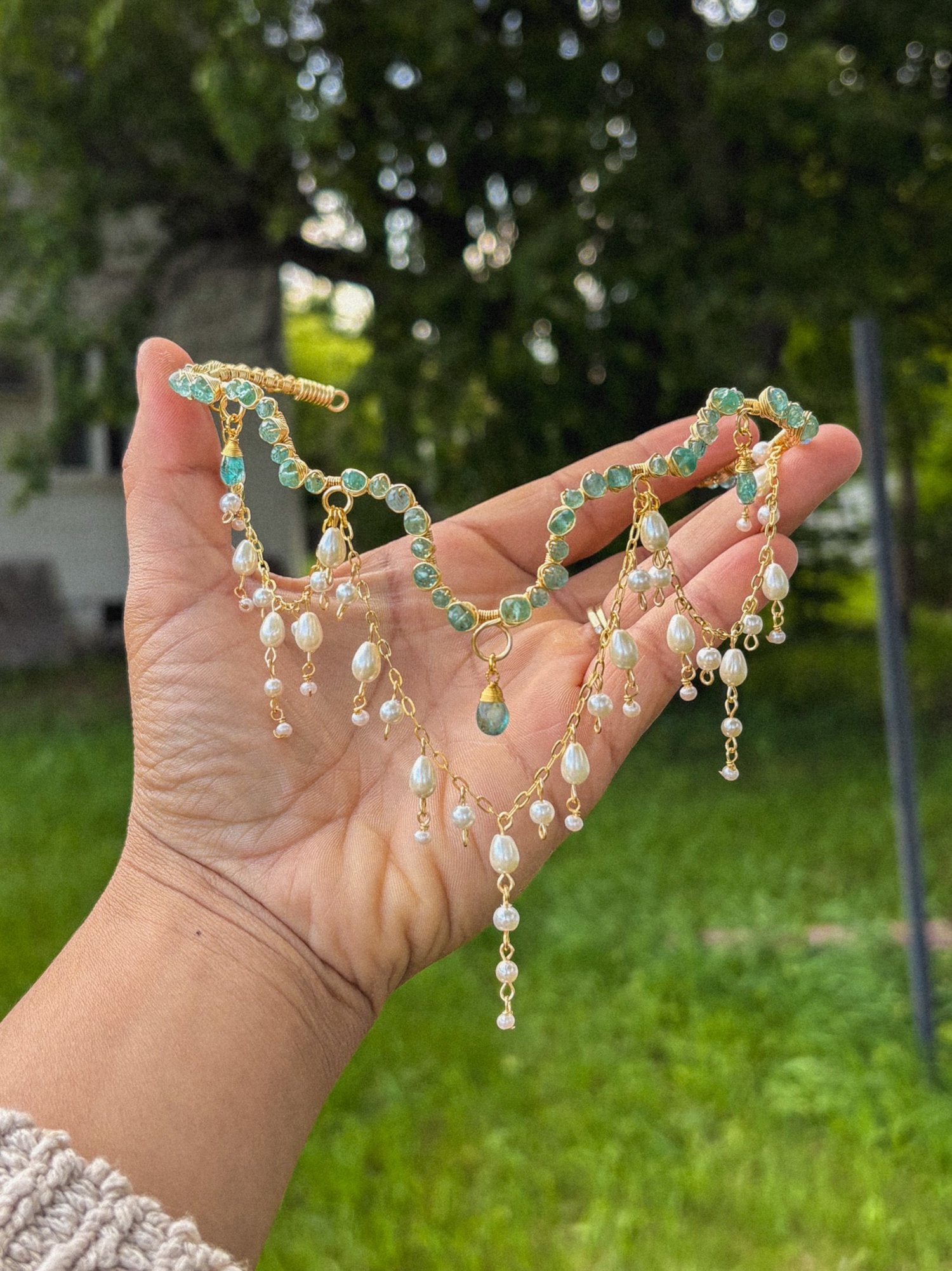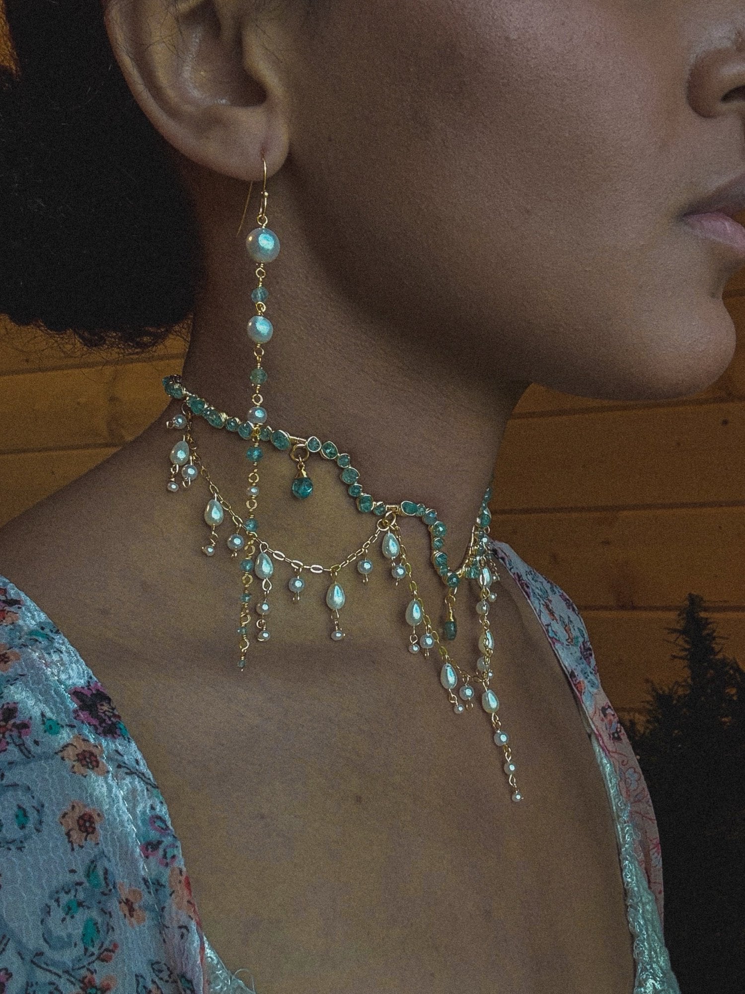 Hand-wired gold choker draped with natural pearls and shimmering aqua gems, inspired by ocean royalty and celestial femininity. A wearable work of art.