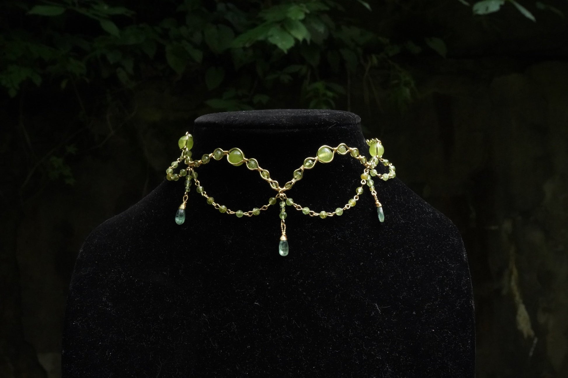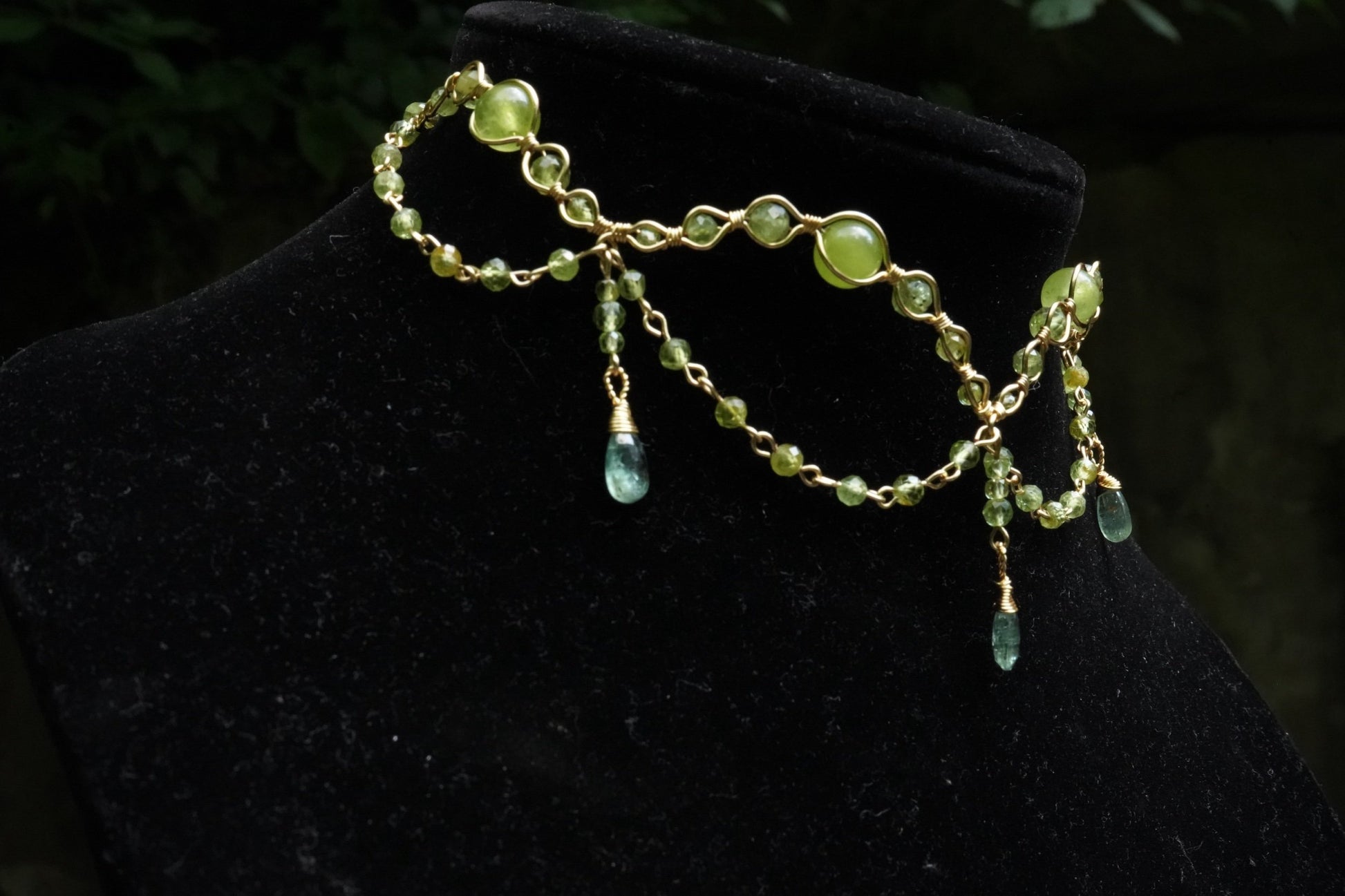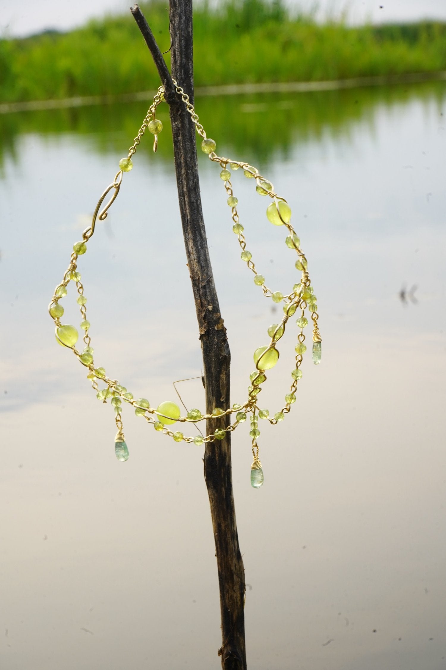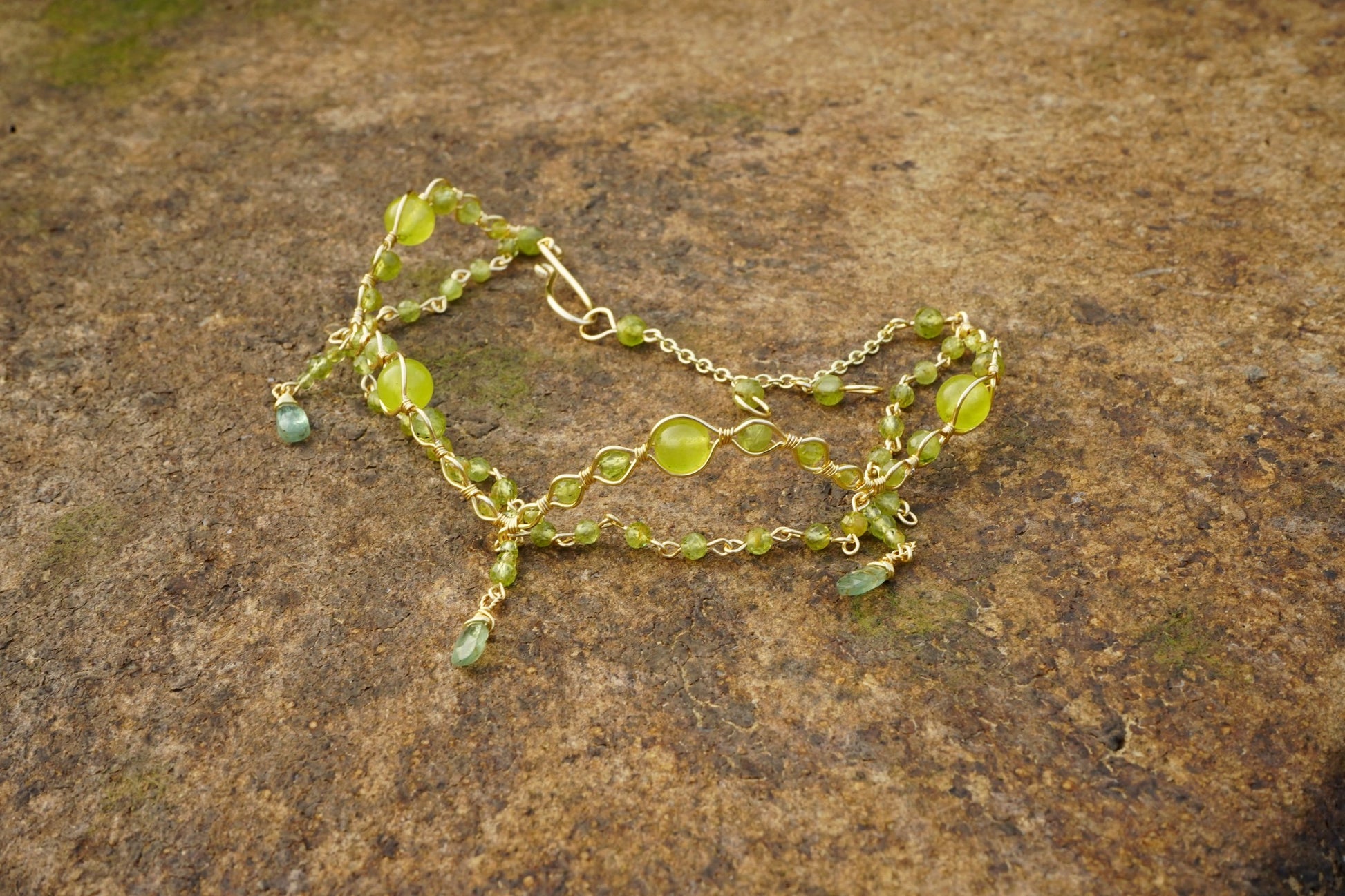 ༺ Earthy peridot and jade beads wrapped around gold wire.