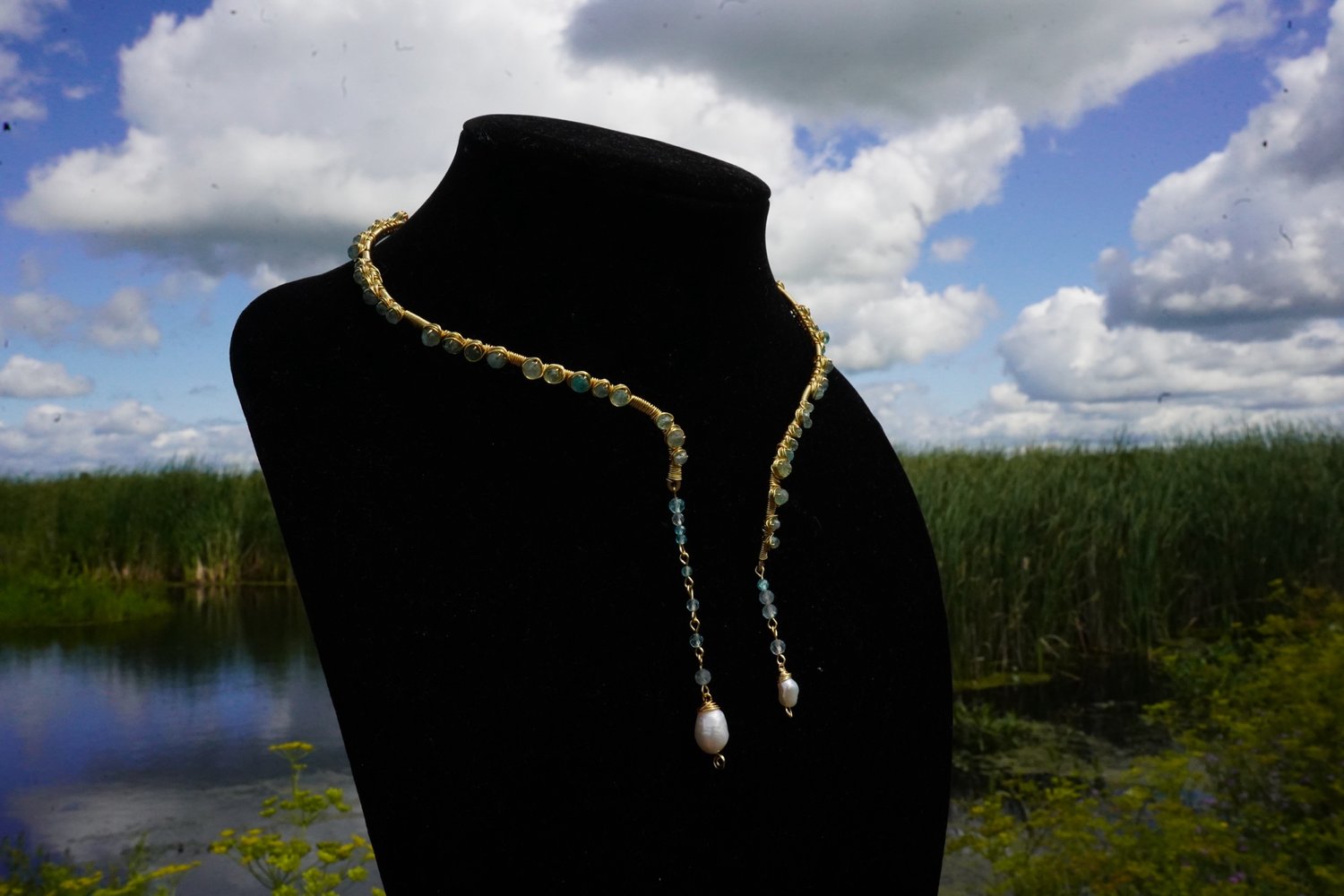 ༺ A reversable pendant necklace made with neon blue apatite and freshwater pearls.