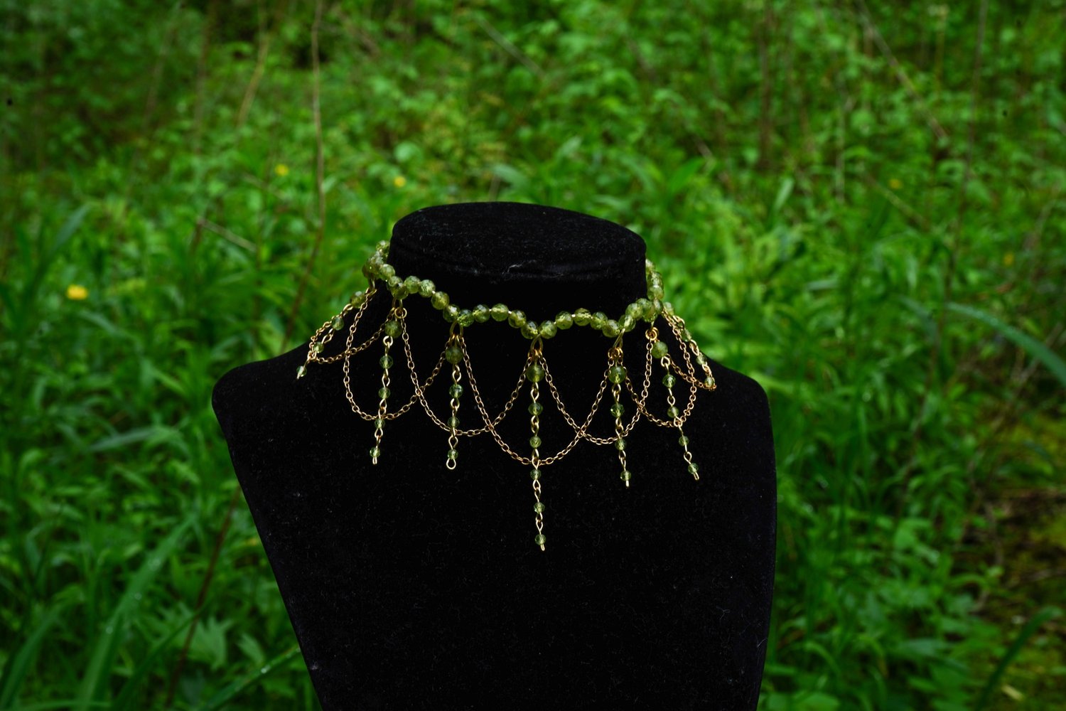 ༺ Reminiscent of the rain forest. A chandelier style necklace made entirely of peridot crystals and adorned with gold chains.